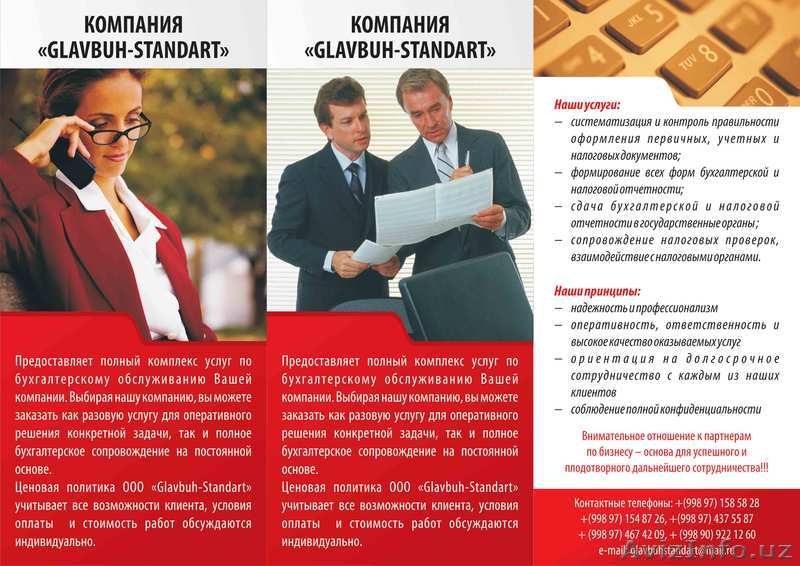 Компания "Главбухстандарт" оказывает услуги по ведению бухгалтерского учета в программе 1С. Обработка первичных документов, подготовка отчетов и сдача, начисление зарплаты, расчет налогов, работа с банком, ГНИ, Халк банк, райстат, горстат. Восстановление бухгалтерского учета, пересдача в ГНИ.Подготовка к проверкам.Предоставление права второй подписи на всех банковских и финансовых документах сотруднику нашей компании по-желанию клиента. Нотариальное заверение карточек с образцами подписей происходит на основании заключенного между нами договора и Вашего приказа.Вам не нужно готовить для бухгалтера рабочее место, у нас оно уже есть.Если Вам удобно, то наш бухгалтер будет приезжать в Ваш офис, согласно графику посещений.Заключите договор с нашей компанией, ведь Ваша бухгалтерия-это Наша работа! Мы работаем на положительный результат. Другие видят лишь цифры - мы видим труд людей, стоящих за ними!