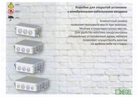 Новая серия разветвительных коробок для открытого монтажа предназначена для организации мест коммутации проводов и кабелей, ввод которых внутрь коробки осуществляется через мембранные гермовводы, выполненные заодно с корпусом. Конструкция замков крышек данных коробок обеспечивает степень защиты внутреннего пространства от проникновения пыли и влаги не ниже IP54. При этом закрывание крышки производится без использования инструмента – защелкиванием. Снятие крышек на них удобно для монтажника благодаря предусмотренному зацепу для пальцев. На крышках изделий предусмотрены поводки, удерживающие крышку на коробке в открытом положении. Для удобства монтажа предусмотрены специальные установочные лапки.