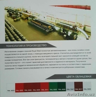 «Royal Steel» – современное, динамично развивающееся металлургическое предприятие, занимающееся производством профнастила и металлочерепицы. Мы успешно работаем на узбекском рынке с 2009 года. За это время, компания успела зарекомендовать себя как надежный деловой партнер., Особой гордостью нашей компании является большой ассортимент цветов стали (в том числе и особых сортов), что позволяет нам отличатся от других аналоговых предприятий., Каждая четвертая профнастилная крыша в Узбекистане покрывается кровлей производства Royal Steel!, Для производства профнастила и металлочерепицы используются только качественное сырье известных фирм, таких как DONGBU STEEL. LTD (Корея), «Магнитогорский металлургический комбинат» (Россия), ОАО «Северсталь» (Россия) и др., Нашим клиентам мы предлагаем гибкую систему скидок и высокую скорость обслуживания. Для постоянных клиентов созданы специальные условия., Royal Steel – это:, индивидуальный и профессиональный подход к каждому клиенту, гибкая система ценообразования, качественный клиентский сервис, современные методы производства, упаковки и складирования продукции., Продукция, Компания Royal предлагает на рынке Узбекистана новинку – металлочерепица, профнастил: 17, 35 алюмооцинкованную сталь с полимерным покрытием Royal Steel. Благодаря высокому уровню адгезии стального листа, по сравнению оцинкованной сталью, алюмооцинкованная сталь с полимерным покрытием, профнастил и металлочерепица AKFA Steel имеет идеально ровное лицевое покрытие и безупречный привлекательный внешний вид благодаря различным оттенкам полимерного покрытие., Royal Steel – это тонколистовая холоднокатаная алюмооцинкованная сталь с цветным полимерным покрытием. В качестве основы используется алюмооцинкованная сталь с предварительной подготовкой поверхности – грунтовочным слоем. В качестве лицевого покрытия используется цветное полимерное покрытие., В качестве основы используется холоднокатаная сталь, покрытие не цинком, а сплавом 55%-ного алюминия, благодаря чему срок службы продлевается от 3 до 6 раз! Покрытие Super Galum имеет 50 летной срок службы., Покрытие выдерживает температуры до 315° без окисления и деформации, что очень важно при производстве металлочерепицы и профнастила., Продукция используется при любых климатических условиях., Технология Royal Steel позволяет смешивать гранулят разных цветов с получением плавных переходов цвета., Идеальным материалом для крышных конструкции, который не теряет своего внешнего вида на протяжении всего срока эксплуатации, служит алюмооцинкованная сталь. Это инновационное покрытие уже давно зарекомендовало себя на рынках Европы, США и Канады как наилучшая замена обычной оцинковке. Многие исторические здание и престижные жилье комплексы в Европе имеют алюмооцинкованную кровлю., Широкая цветовая гамма обеспечивает эффективный ответ требования по реализации оригинальных кровель высокого эстетичного знания, при этом гарантируя абсолютное хроматическое внедрение кровли в контексте окружающей среды., Важно! Аксессуары для крыши изготавливаются на 6 метровом авто-листогибе, который является единственном в Центральном Азии. Royal Steel — производство профнастила и металлочерепицы, О компании, «Royal Steel» – современное, динамично развивающееся металлургическое предприятие, занимающееся производством профнаст