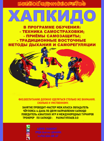 Поделитесь объявлением Путь объединение энергии-ХАПКИДО- с друзьями, знакомыми, потенциальными клиентами, используйте для этого социальные сети, мессенджеры. Это придаст объявлению популярности и эффект многократно повысится.