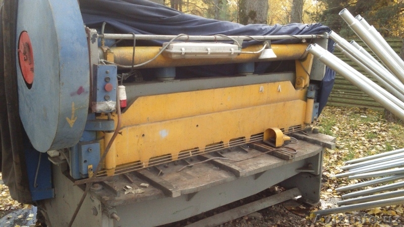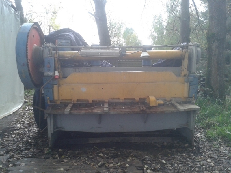 При перевозке перерублен подводящий кабель. Ножницы кривошипные листовые с наклонным ножом Н3118 (гильотина) предназначены для прямой продольной и поперечной резки листового металла. Резка листа производится за один ход ножа по разметке или по упору. Модель н3118. Наибольшая толщина разрезаемого листа мм 6, 3 при 0в =50 кг/мм2. Наибольшая ширина разрезаемых листов мм 2000. Расстояние от кромки неподвижн. ножа до станины (вылет) мм 500. Число ходов ножа в минуту ход/мин, 55. Угол наклона подвижного ножа град. 1o30′. Ширина отрезаемого листа по заднему упору — наибольшая мм 900. Ход ножа мм 80. Число режущих кромок ножа шт. 4. Расстояние между стойками в свету мм 2410. Номинальное усилие реза кг 20000. Габариты ножниц в плане—спереди—назад. с удлинителем мм 1950. без удлинителя мм 1930. слева—направо мм 3160. Высота над уровнем пола мм 2175. Вес ножниц кг 5100