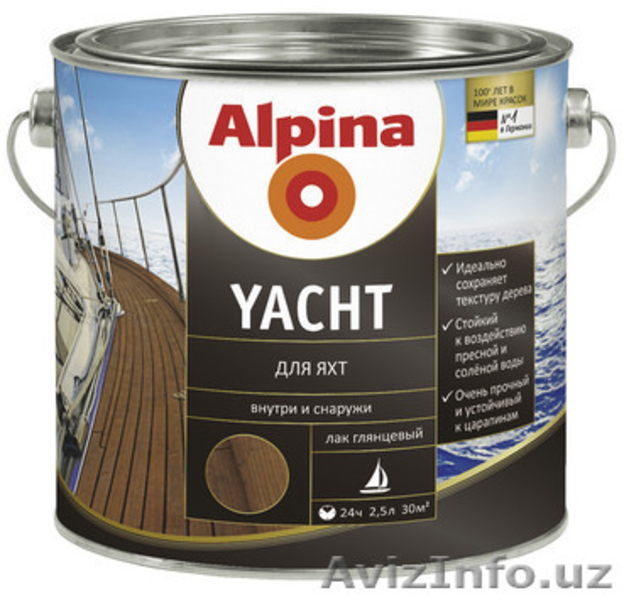 С этим специальным лаком, пригодным как для пресных, так и для соленых вод, Вы получаете идеальную защиту для подводных и надводных деревянных частей Вашего судна. Конечно, Вы можете использовать Alpina Yacht как для внутренних, так и для внешних работ и по другим деревянным поверхностям. Такое покрытие особенно годится для деревянных поверхностей, подвергаемых большим нагрузкам, сохраняя при этом уникальную текстуру древесины. Alpina Yacht обеспечивает долговечную и устойчивую к царапинам окраску, устойчивую к истиранию, и идеально подходит для эластичных поверхностей.